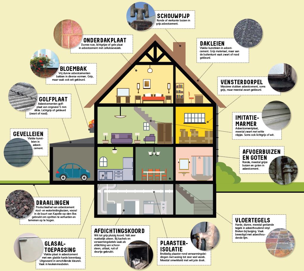 Onderaan vind je een handig overzicht van de plaatsen waar asbest aanwezig kan zijn aan de binnen- en buitenkant van je woning.